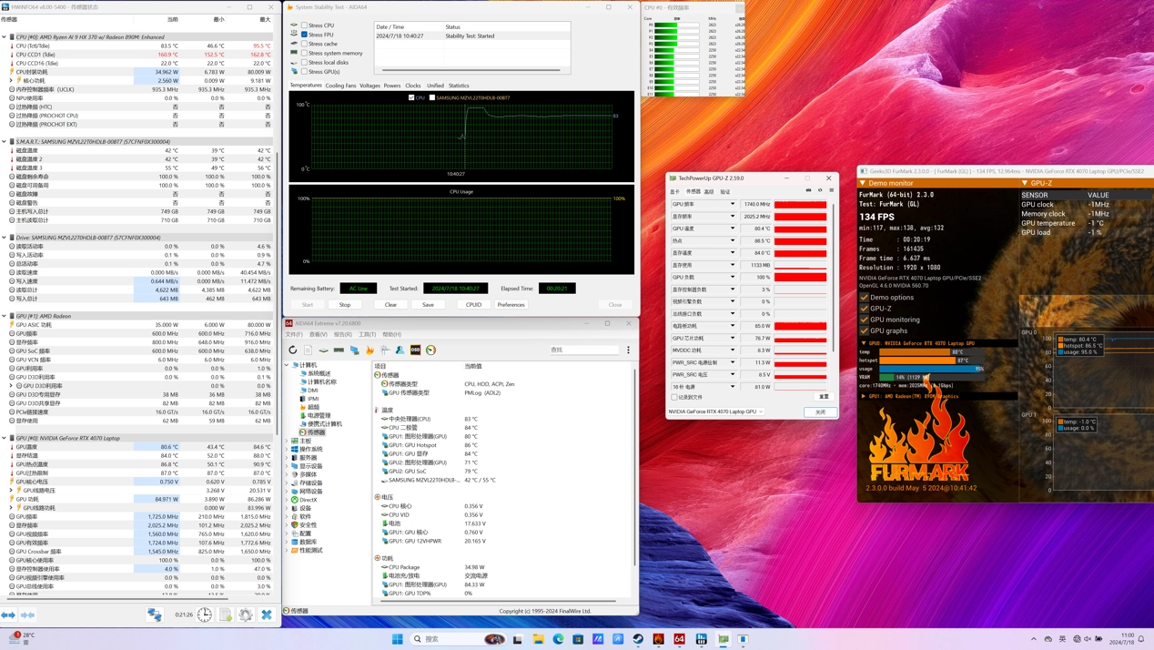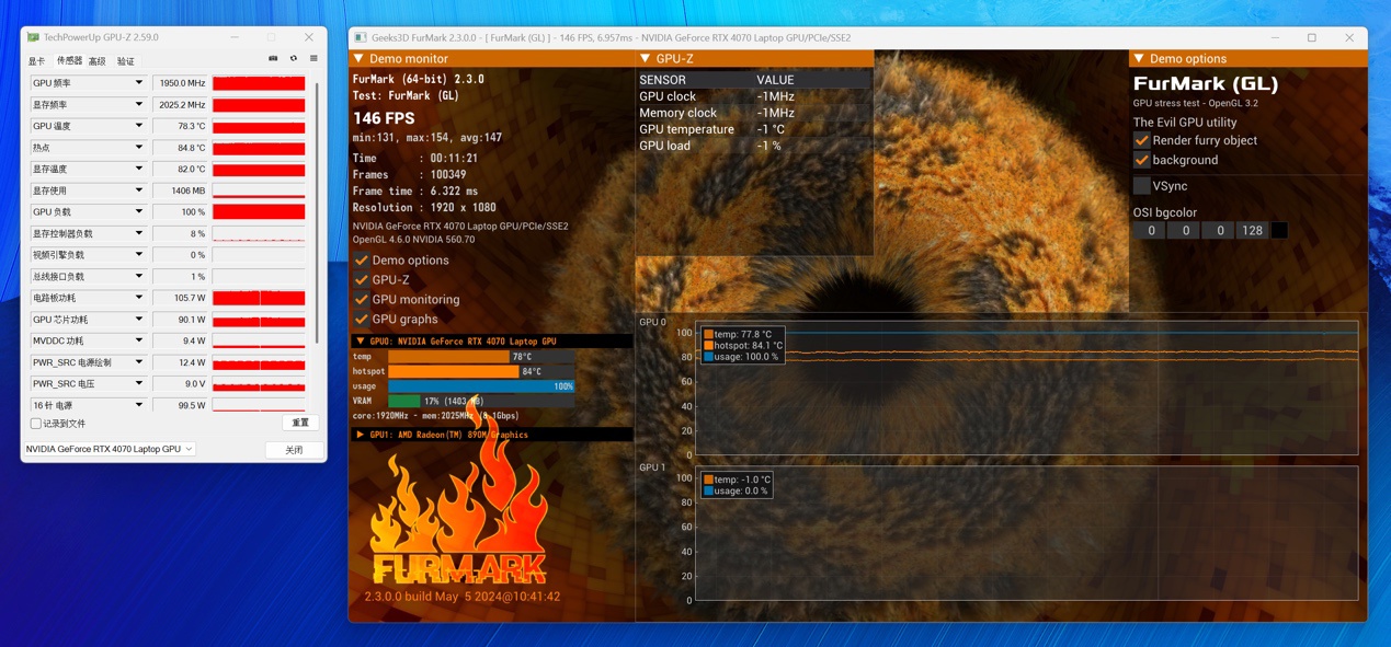接着单烤 10 分钟的 GPU,此时 GPU 功耗在 105W 上下,GPU 温度为 78.3 度,显存温度 82 度,GPU 核心频率保持在 1950MHz 左右。