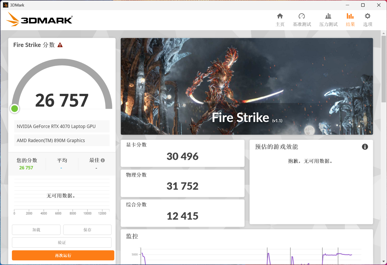 在 3D Mark 的 Fire Strike 测试中,CPU 物理分数为 31752 分,显卡分数为 30496 分。