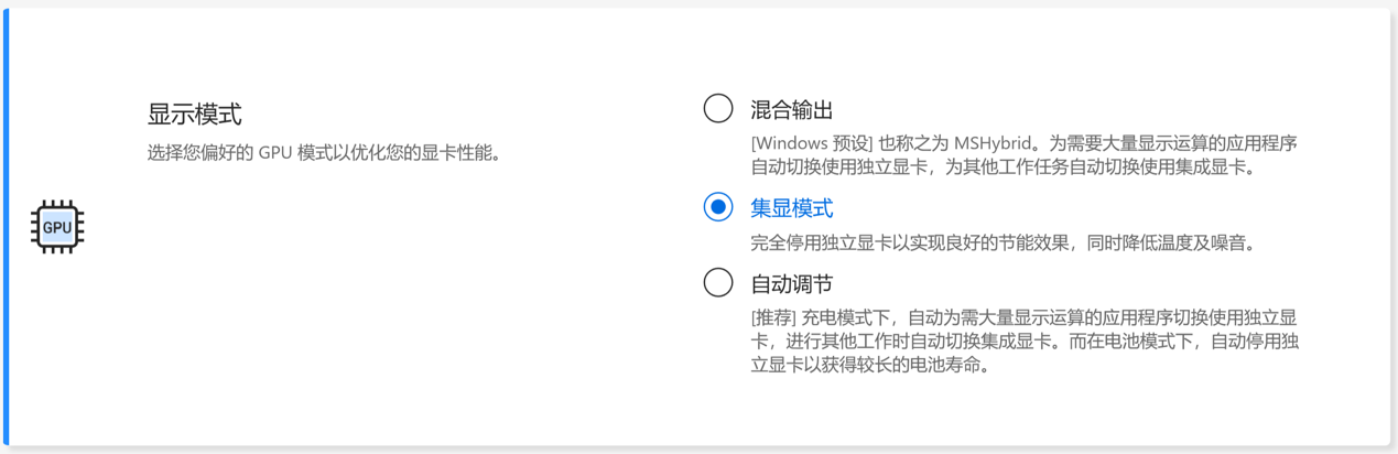 而在显卡输出模式上,则提供了混合输出,集显输出和自动调节三种,测试环节我们均采用高效模式 + 自动调节设置作为基准环境。