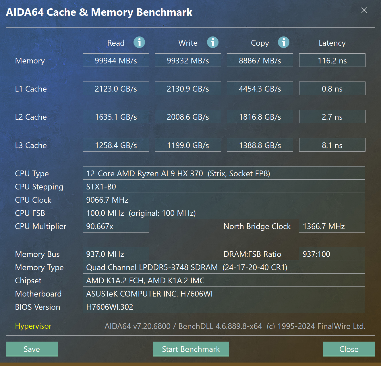 内存为板载 64GB 双通道 LPDDR5x 7500MHz 规格,读写速度均接近 100GB/s,延迟稍微要高一些,达到了 116.2ns,L3 缓存延迟为 8.1ns。