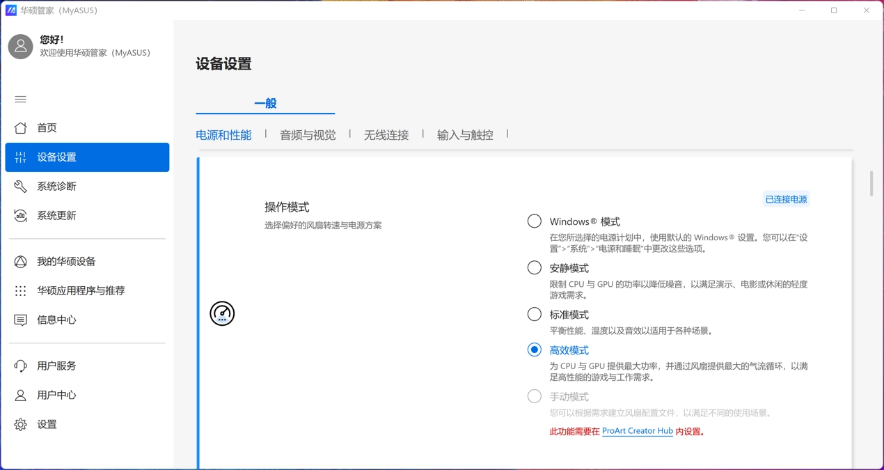 测试之前还有一点需要说明,华硕电脑管家中提供了四种性能模式预设,用户可以按照自己的实际需求进行选择,兼顾性能与续航。