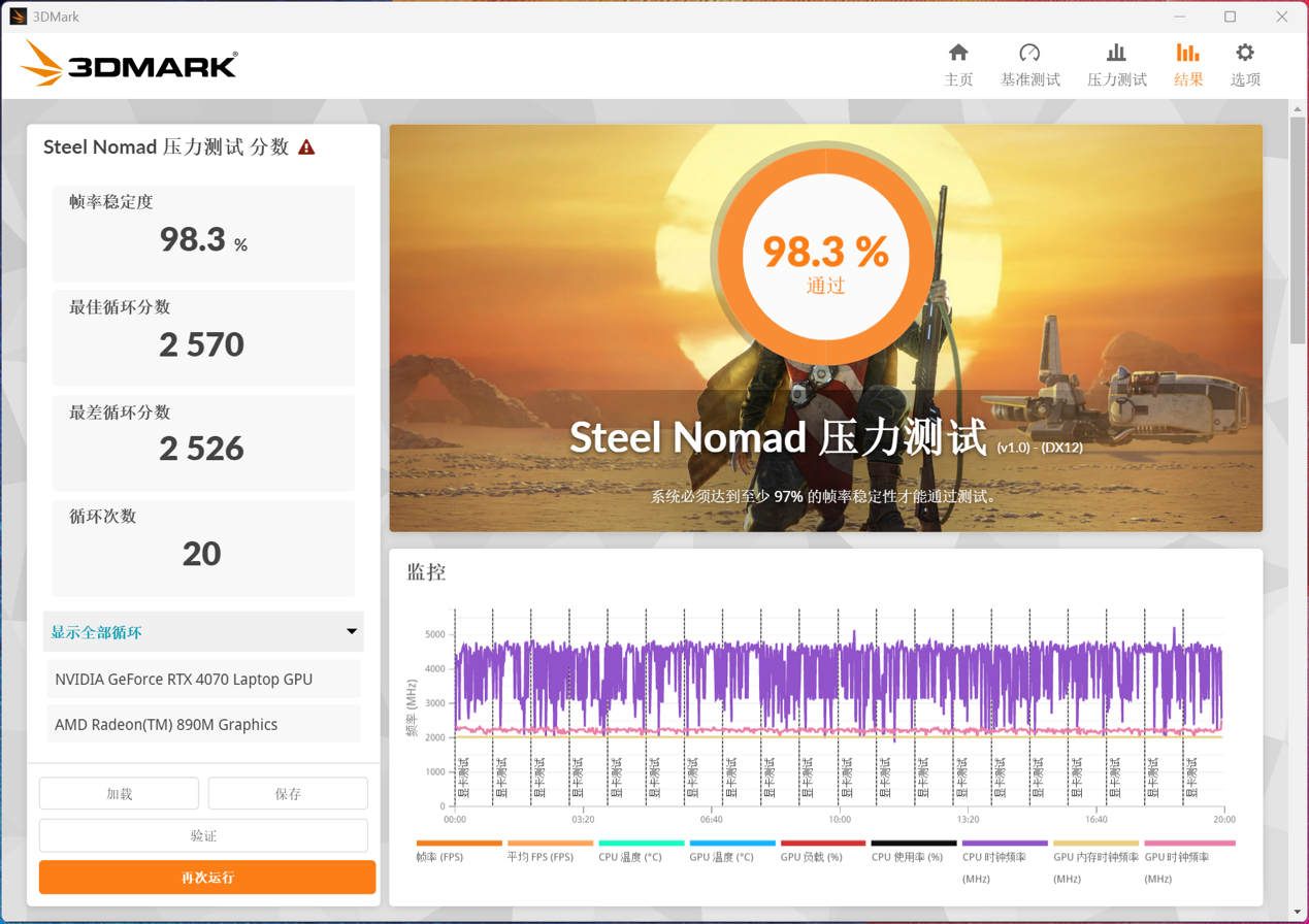 我们还进行了 Steel Nomad 的新版显卡压力测试,20 轮循环跑分后的帧率稳定性来到了 98.3%,轻松通过测试,表现也是相当稳的。