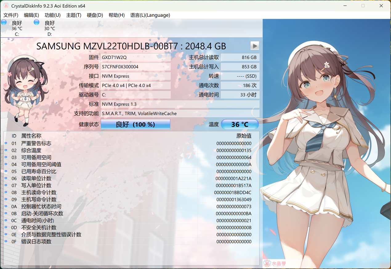 通过软件查询,具体型号为三星 PM9A1 低功耗版,容量 2TB,实际硬盘读写速度如图所示,跑出了 7052MB/s 的顺序读取速度以及 5000MB/s 的顺序写入速度。