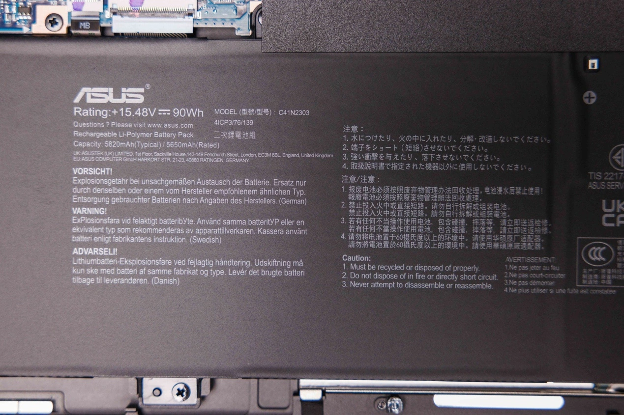 最下面还有一块 90Wh 超大长续航电池,IT之家通过本地视频播放对它的续航进行了实测。在初始电量 100% 情况下,选择安静模式 + 集显输出,50% 屏幕亮度 + 50% 外放音量,使用 Windows 自带播放器播放 1080P 电影 1 小时,电量下降至 90%,耗电 10%。考虑到这是一块 4K 分辨率的屏幕,这样的续航表现可以接受。