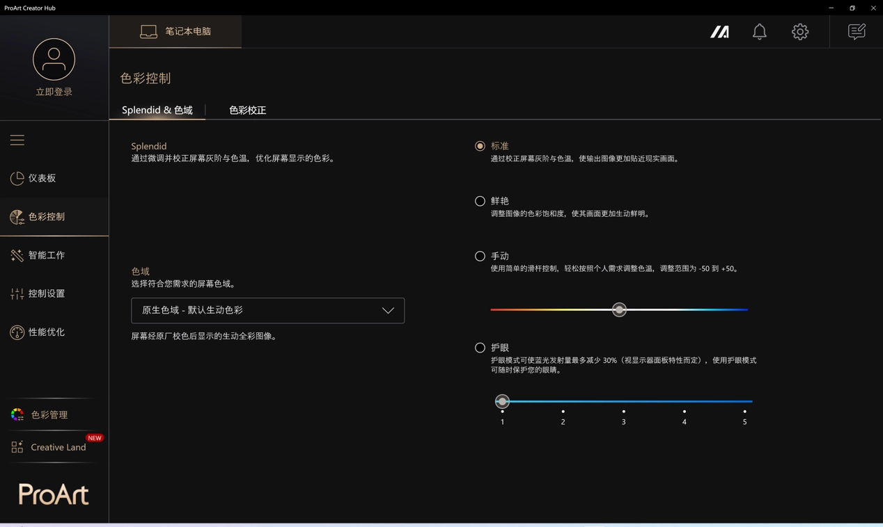 IT之家也对这块屏幕的素质进行了实际测试,首先需要说明的是 ProArt 创 16 2024 内置了一款创作辅助软件 ProArt Creator Hub(创作者中心),自带色域切换和色彩校正功能。我们找到色彩控制标签栏,就能看到色彩管理选项。电脑默认采用原生色域模式,也支持切换到 sRGB 色域、DCI-P3 色域以及 Display P3 色域,右侧还可以选择饱和度风格,色温调节和护眼等选项。