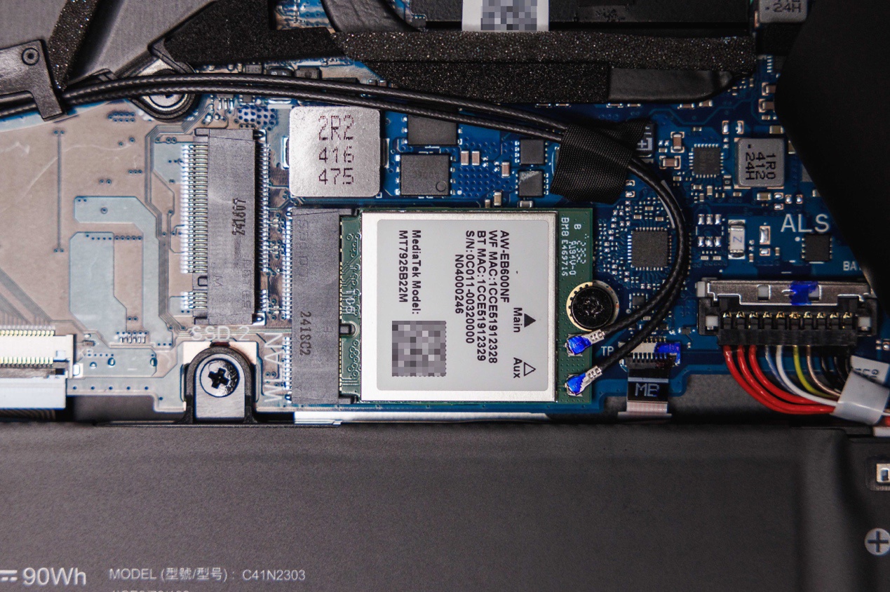 左侧 M.2 插槽旁边是型号为 MT7925B22M 的 Wi-Fi7 网卡。