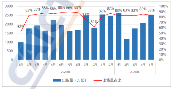 据中国信通院公布的数据显示,2024年5月,国内市场手机出货量3032.9万部,同比增长16.5%,国产品牌手机出货量2530.1万部,同比增长12.8%,占同期手机出货量的83.4%。