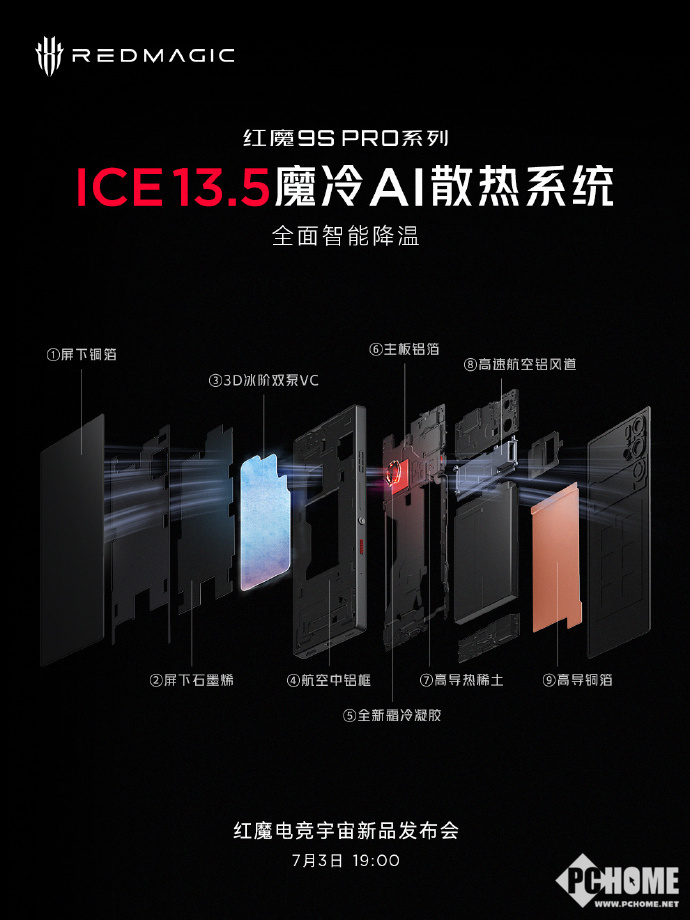 据了解,红魔9S Pro系列AI游戏手机将搭载多层精密散热的ICE 13.5魔冷散热系统,万级冰阶VC+创新霜冷凝胶+合金鲨鱼鳍高速离心风扇,可以让机身温度最高下降19.5℃,CPU核心温度最高下降25℃。