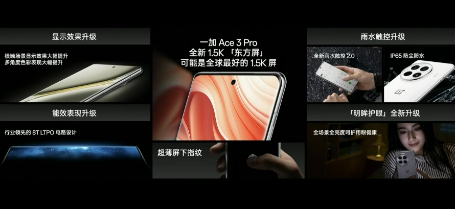 此外,该机还搭载 1.5K“东方屏”(IT之家注:8T LTPO 电路设计),支持雨水触控 2.0、IP65 防尘防水、超薄指纹解锁、明眸护眼。