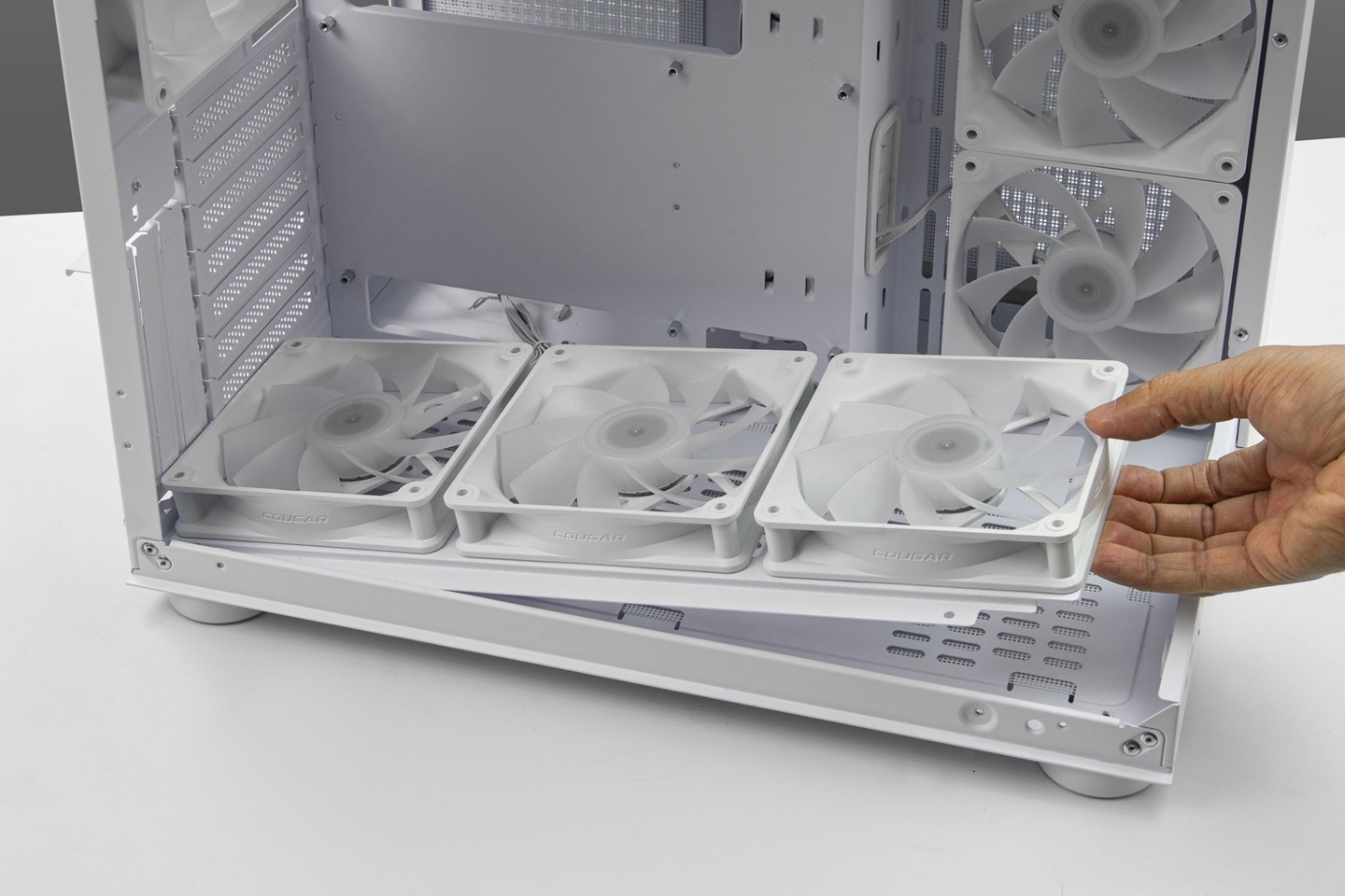 骨伽还为这款机箱配备了底部风扇支架。用户可先将底部风扇固定在支架上再一起装入机箱中,更加省心省力。