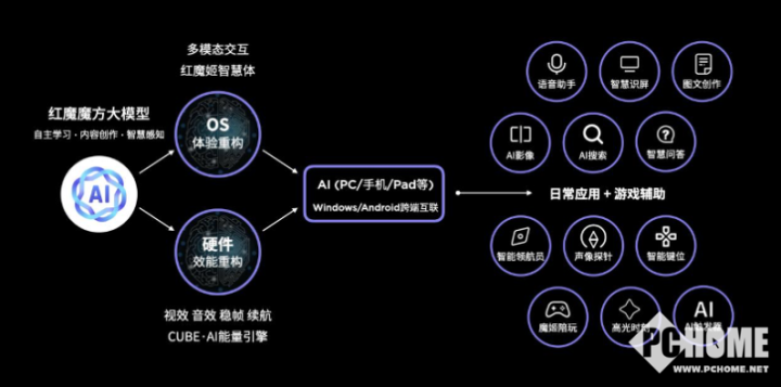 随着人工智能技术的迅猛进步,AI正在为各行各业带来颠覆性的变革。作为游戏手机领域的领军品牌,红魔积极投入AI研发,致力于将AI技术融入游戏体验,并于本次发布会正式发布红魔自主研发的红魔魔方AI大模型。依托于庞大的1600亿量级数据库和超过2万种不同场景的训练,涵盖图片处理、文生图、文生文、AI助手、AI性能调度、AI陪玩、AI键位触发器、声像探针、高光时刻等一系列功能,不管游戏还是日常应用都带来前所未有的AI体验。