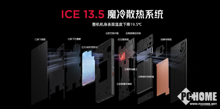 拥有性能如此出众的超强芯片,要满血输出散热必须跟上。搭载ICE 13.5魔冷散热系统,独创大面积万级冰阶VC,风冷升级,风道均热面积提升100%。全新转速达22000转合金鲨鱼鳍风扇,铸就红魔卓越的散热效能。