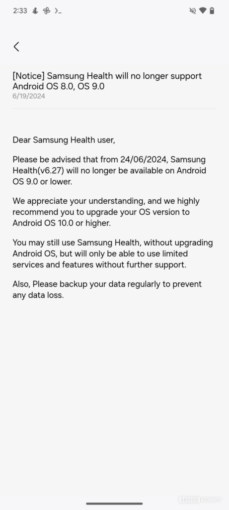 “请注意,从2024年6月24日起,三星健康(v6.27)将不再适用于运行Android OS 9.0或更低版本的设备。”消息显示,并继续说明那些希望享受新功能和进一步支持的用户应升级到至少Android 10。