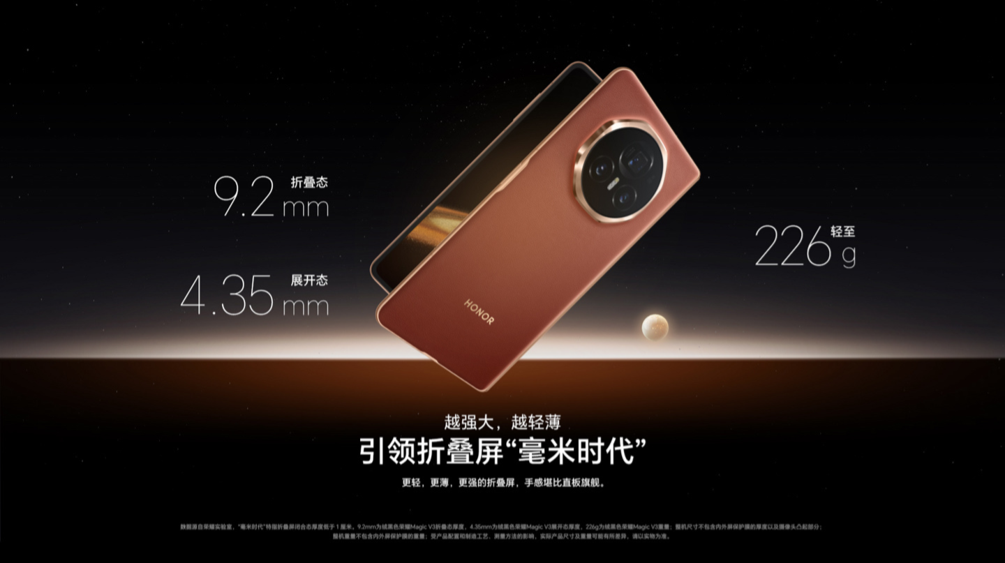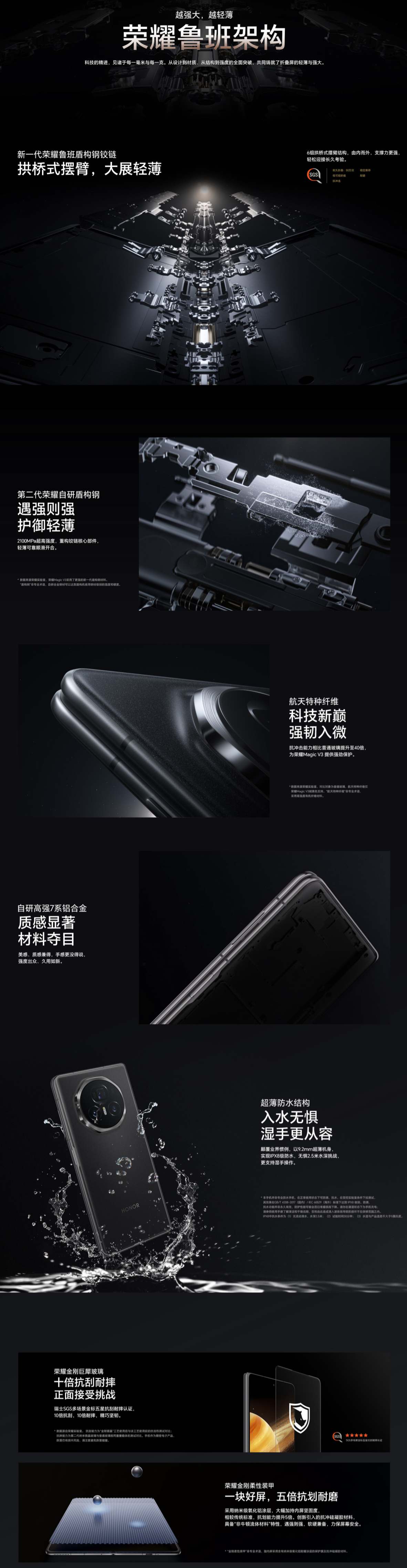 荣耀 Magic V3 使用航天特种纤维机身,将强度 5800MPa 的“纤维之王”应用到荣耀 Magic V3 绒黑色版本上,采用第二代荣耀盾构钢打造折叠铰链,厚约 2.84mm。