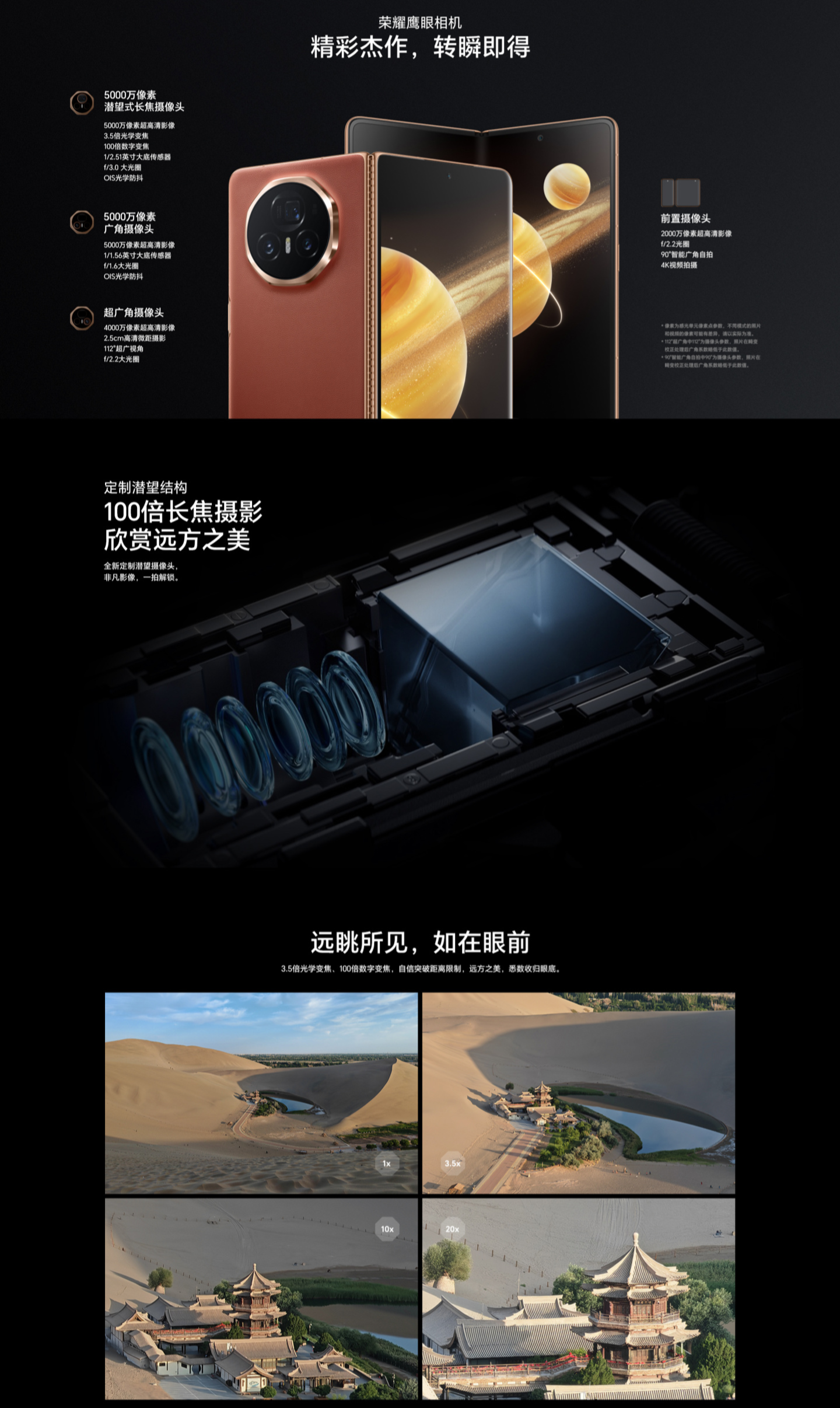影像方面,荣耀 Magic V3 搭载 5000 万潜望长焦主摄、4000 万广角微距主摄、5000 万荣耀鹰眼主摄搭载 SMA 记忆金属马达,支持悬停自动抓拍。该手机内、外屏均配备 2000 万像素镜头,支持 90° 智能广角自拍和 4K 视频拍摄。