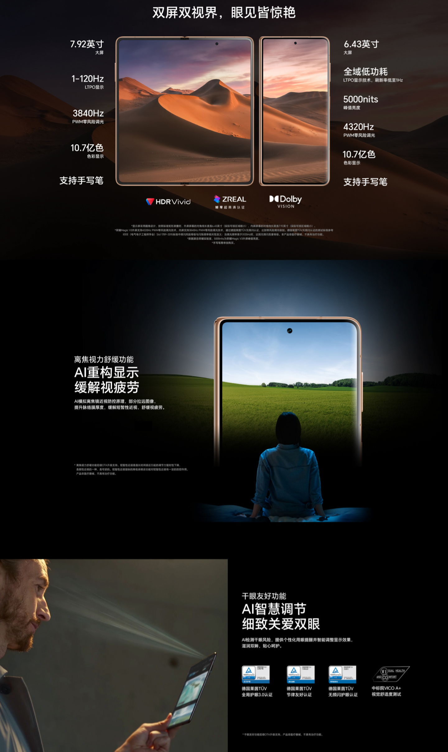 内屏参数上,该机搭载 7.92 英寸 2344×2156 京东方 OLED 内屏,1600nit 局部峰值亮度,屏幕比例 10:9,支持 1-120Hz LTPO 刷新率,3840Hz 高频 PWM 调光,支持 10.7 亿色、荣耀视力舒缓绿洲护眼、全屏 AOD 显示、荣耀金刚柔性装甲。
