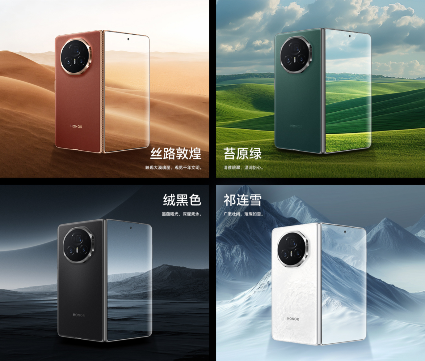 该手机的镜头采用穹顶八边设计,提供丝路敦煌、苔原绿、绒黑色 、祁连雪 4 款配色,折叠态厚度 9.2mm,展开态厚度 4.35mm,重约 226g。