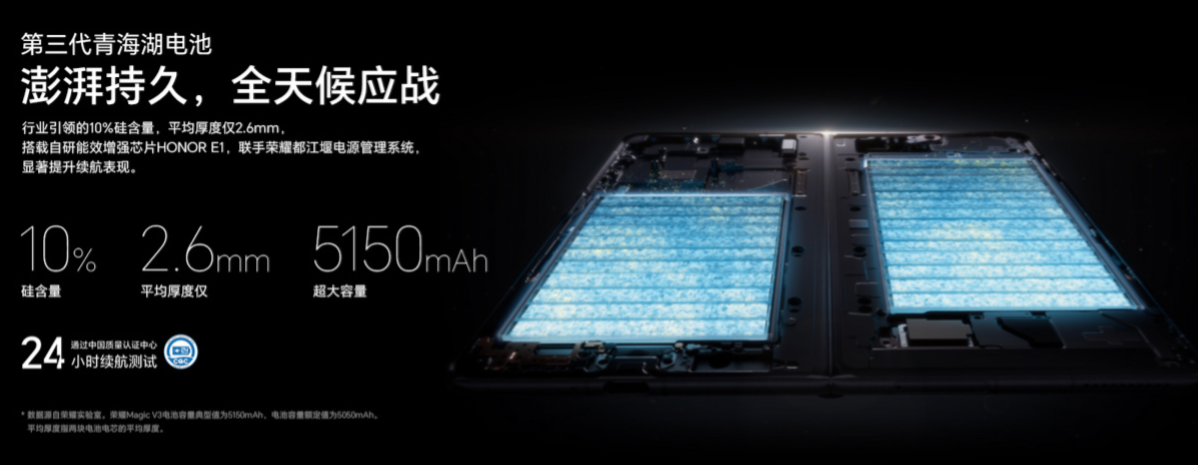荣耀 Magic V3 首发第三代青海湖电池,硅含量突破 10%,电池容量 5150mAh,电池的平均厚度 2.6mm,内置自研能效增强芯片 HONOR E1 和荣耀都江堰电源管理系统。