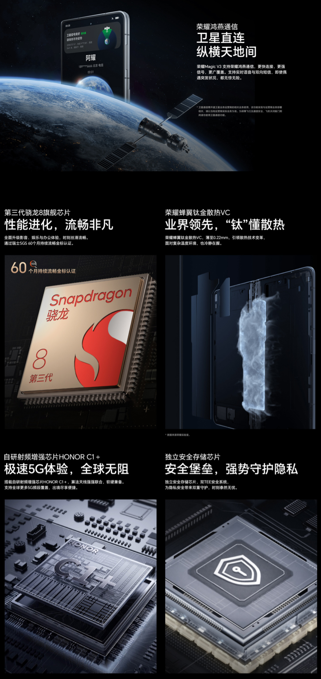 荣耀 Magic V3 搭载高通骁龙 8 Gen3 处理器,配备纯钛散热 VC;支持双向卫星通信,可实现双向语音通话和双向短信收发。