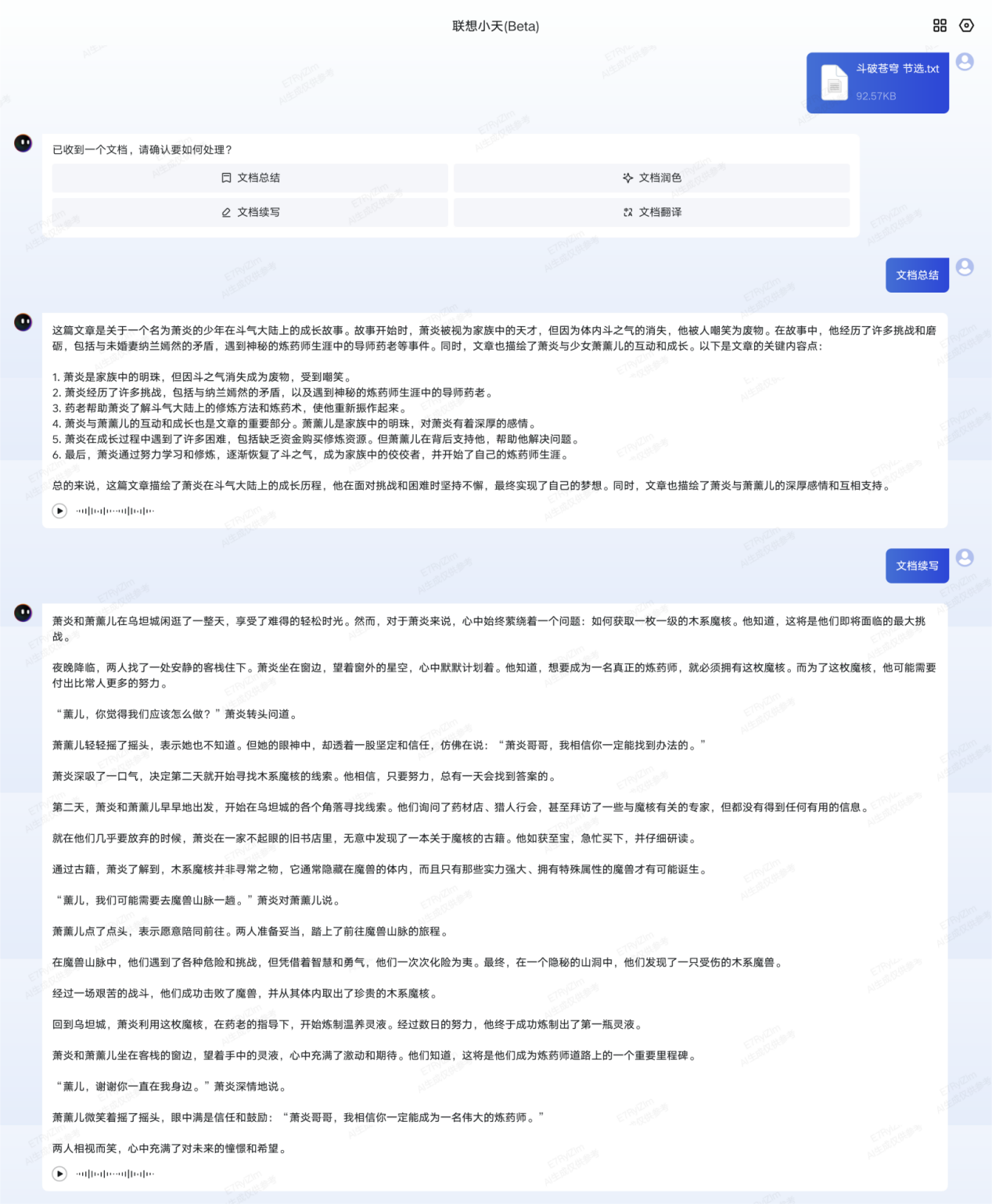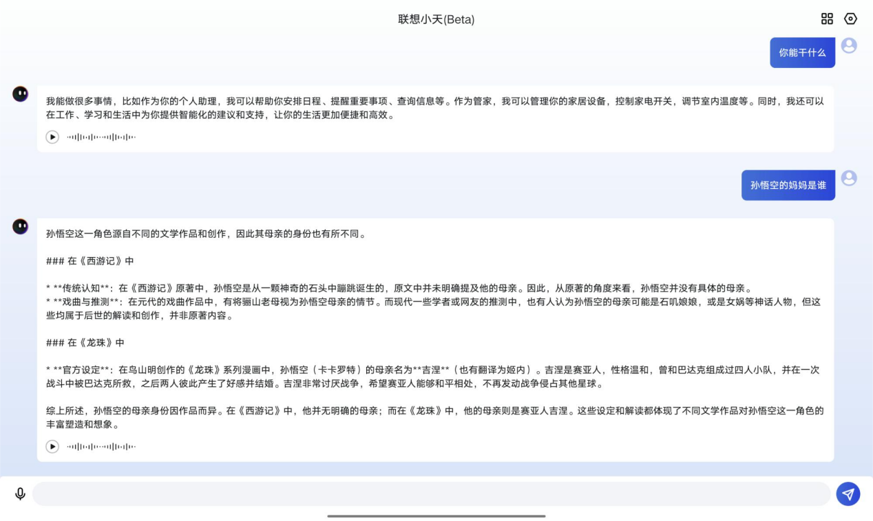 实测下来,联想小新能够对小说内容进行总结和归纳,甚至能够对后续内容进行扩充补写,剧情走向稳定,人物关系和道具名称也没有出现差错。在提问环节,即便是面对类似“孙悟空的妈妈是谁”这种极限问答,联想小天依旧能给出符合大众认知的答案。
