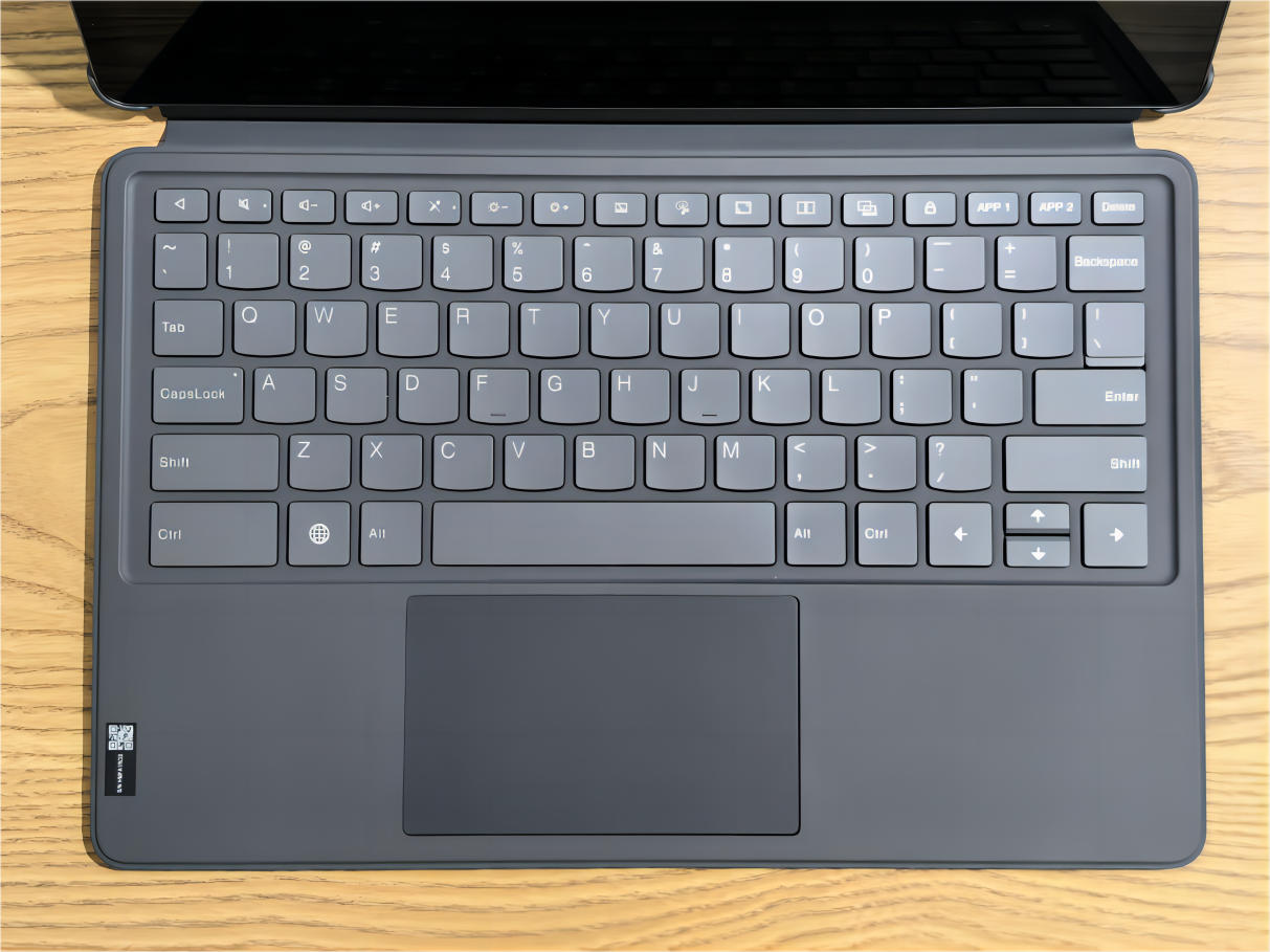 另外,这款键盘的设计跟笔记本类似,按键手感回弹适中,作为平板配件,在舒适性上基本无槽点。键盘下半部分配有一块大尺寸触控板,支持多指触控和手势操作。较为激进的一点是,键盘顶部取消了 F 功能按键,直接设置常见快捷键,一步到位式地降低用户学习使用成本,支持一键调节音量、亮度,进行分屏、锁屏、截图等操作。同时,键盘右上角还配有两颗自定义 App 快捷键,可快速启动设定好的应用。