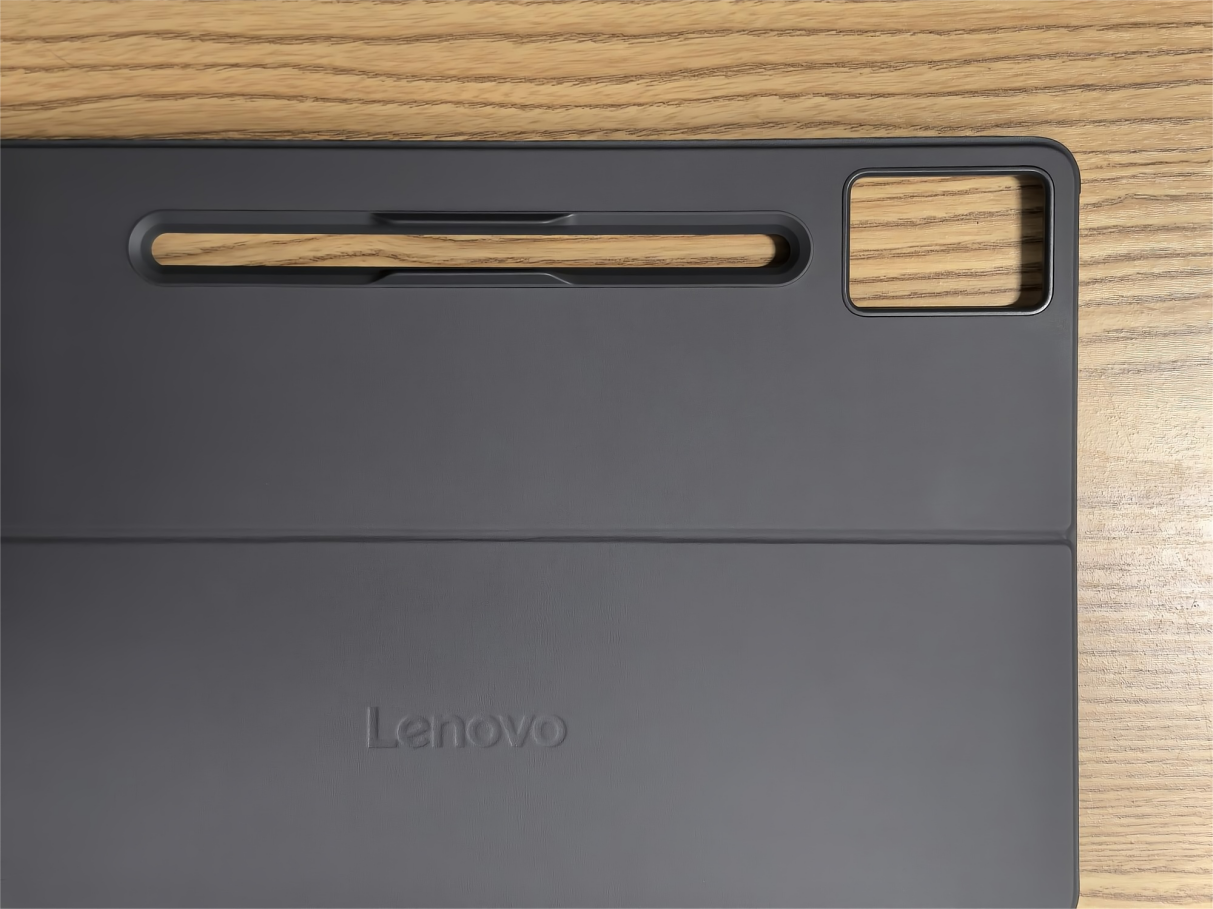 原装键盘配件采用分离式设计,分为支架保护壳和磁吸触点键盘两部分。键盘通过磁吸触点与平板完成连接,无法脱离平板单独使用。整体安装完成之后,颇有 Surface 类似物的味道。另外,官方提供的支架保护套在手写笔的磁吸区域预留槽位,上下两边设置凸起,既保护手写笔,也避免出现磁吸不稳的情况。