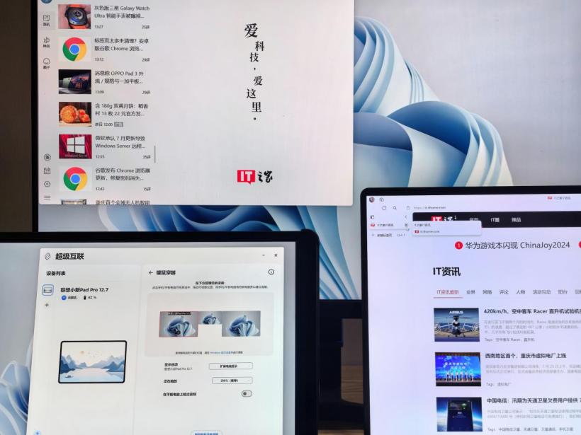 首先,小新 Pad Pro12.7,屏幕尺寸为 12.7 英寸,大小相较于 iPad Pro 11 英寸和 MatePad Pro 11 英寸产品,更接近笔记本的屏幕大小,多屏互联的使用体验更加无缝;其次,联想超级互联支持多台显示器连接后,依旧能够接入平板使用;最后,小新 Pad Pro 多平互联可支持异品牌笔记本连接使用。