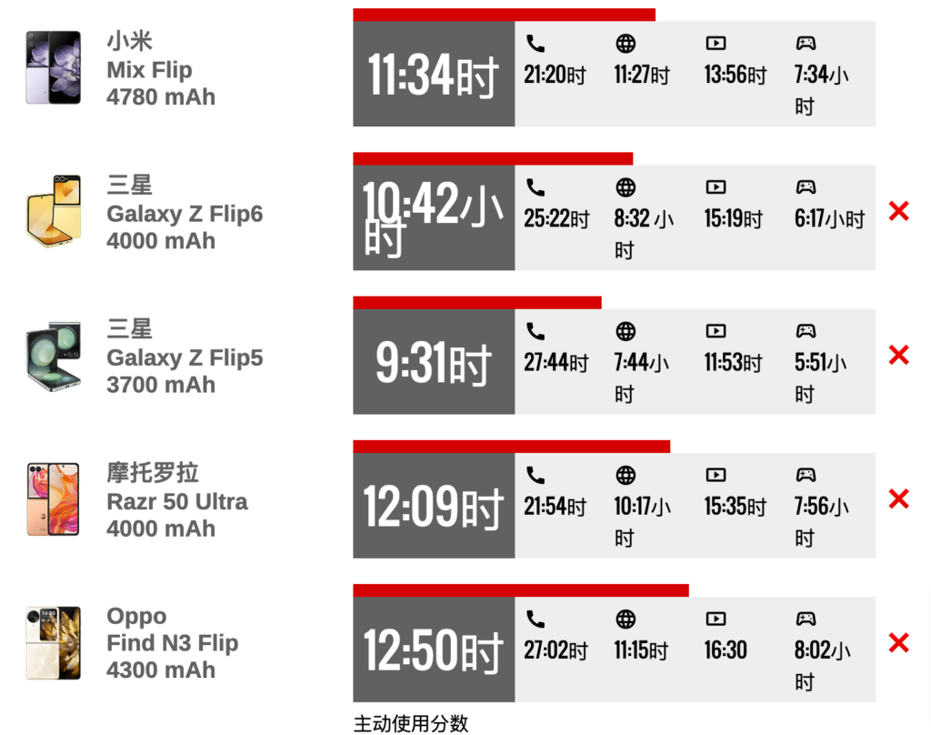 在通话时间方面,Mix Flip的21小时20分钟成绩略显不足,但它在网页浏览续航表现上击败了其他竞争对手。相比之下,Galaxy Z Flip6虽然使用了相同的芯片,但其电池容量小了15%,影响了整体得分。然而,小米Mix Flip在视频和游戏播放续航测试中仍未能超越其他竞争对手。