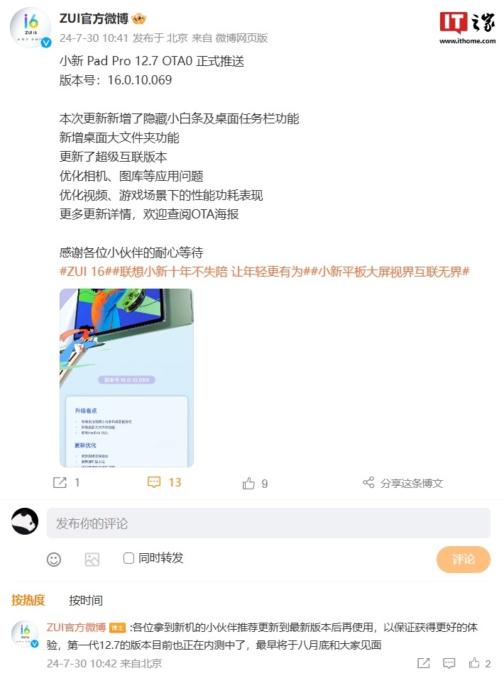 IT之家 7 月 30 日消息,联想小新 Pad Pro 12.7 平板(二代)正式 OTA 推送 ZUI 16.0.10.069 版本更新,新增支持隐藏小白条,升级超级互联等功能。
