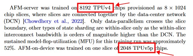 根据论文描述,苹果公司使用 8192 片 TPUv4 芯片训练 AFM-server 模型;2048 片 TPUv5p 芯片训练 AFM-on-device 模型。