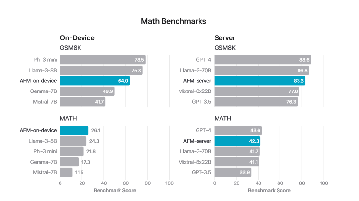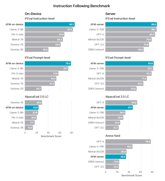 苹果公司的数据显示,AFM-server 有害输出违规率为 6.3%,明显低于 GPT-4 的 28.8%。同样,在设备上,AFM 7.5% 的违规率低于 Llama-3-8B(由 Facebook 母公司 Meta 训练)21.8% 的得分。
