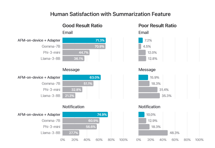 在电子邮件、信息和通知汇总方面,设备上的 AFM 的满意度分别为 71.3%、63% 和 74.9%。研究论文还指出,这三个模型分别领先于 Llama、Gemma 和 Phi-3 模型。IT之家附上相关性能结果如下: