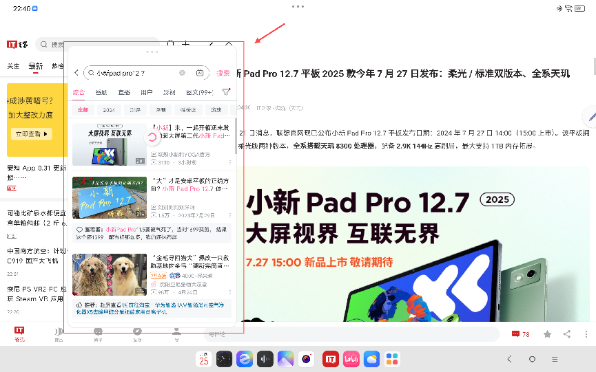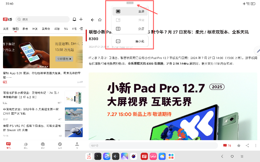 此外用户还可以点击应用界面中的一个三点图标,通过点击它直接选择全屏、浮窗、分屏或最小化等操作。得益于 12.7 英寸的广阔屏幕,即便同时打开三个浮窗,它们也互不干扰。用户还可以通过简单的手势操作,一键将所有窗口快速退回后台。