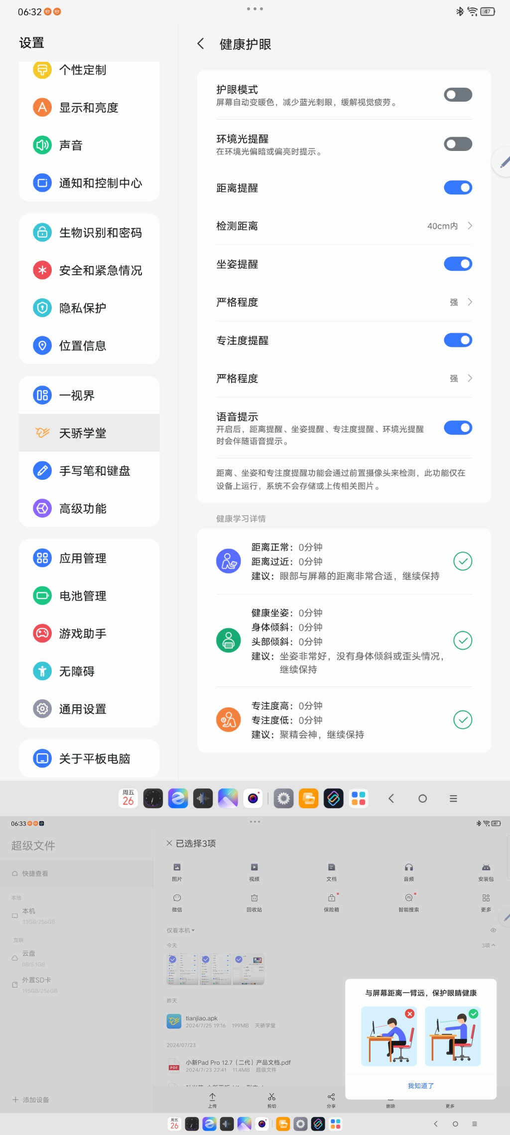 联想小新 Pad Pro 12.7 还特别为学生设计了学习辅助模式,家长可以通过设置启用护眼模式、距离提醒、坐姿提醒和专注度提醒等辅助功能。例如,当孩子观看屏幕的距离过近或坐姿不当时,设备会发出提醒,直到孩子调整到合适的状态。通过学习助手的健康护眼功能,家长可以监控孩子的平板使用情况。