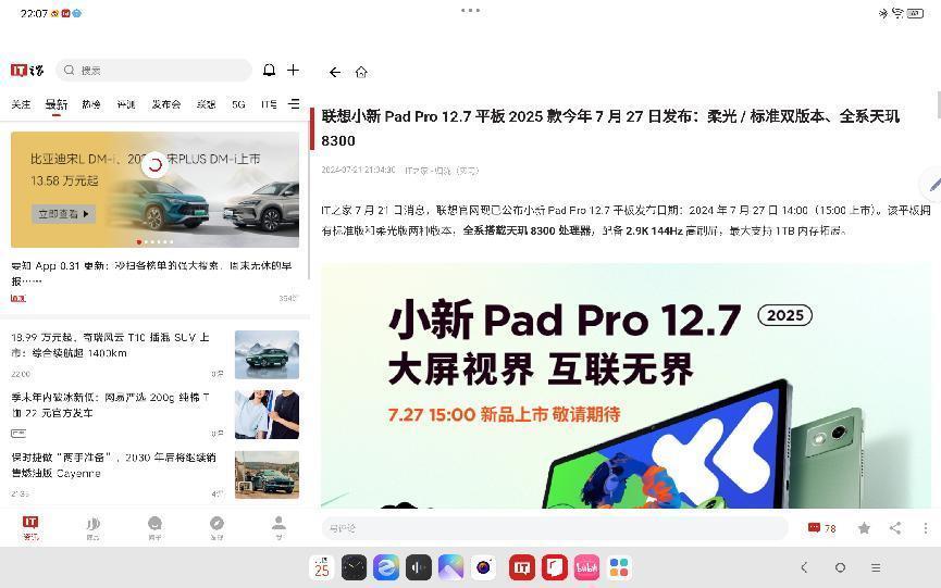 平行视窗功能允许用户在屏幕上同时查看多个应用程序,实现高效的多任务操作。联想小新 Pad Pro 12.7 支持双应用同屏显示。例如,你可以在屏幕一侧观看教学视频,同时在另一侧使用笔记应用记录要点。用户可以根据个人习惯和需求自由调整两个应用的显示比例,实现界面大小的个性化设置。此外,该功能还支持在单一应用内展示不同的内容页面,且互不干扰,如在微信中同时浏览朋友圈和进行聊天。