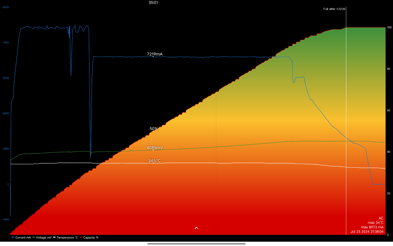 充电实测部分,联想平板小新 Pad Pro 从 1%-100% 完全充满耗时 1 小时 22 分钟,半小时充入 44%,一小时充入 81%,到平板端的峰值输入功率达到了 36W,对于这么大的电池来说算是一个非常不错的充电表现。值得一提的是,在充电过程中电池温度几乎没有明显的提升,这对边充边玩这种场景下的使用体验来说是非常友好的。