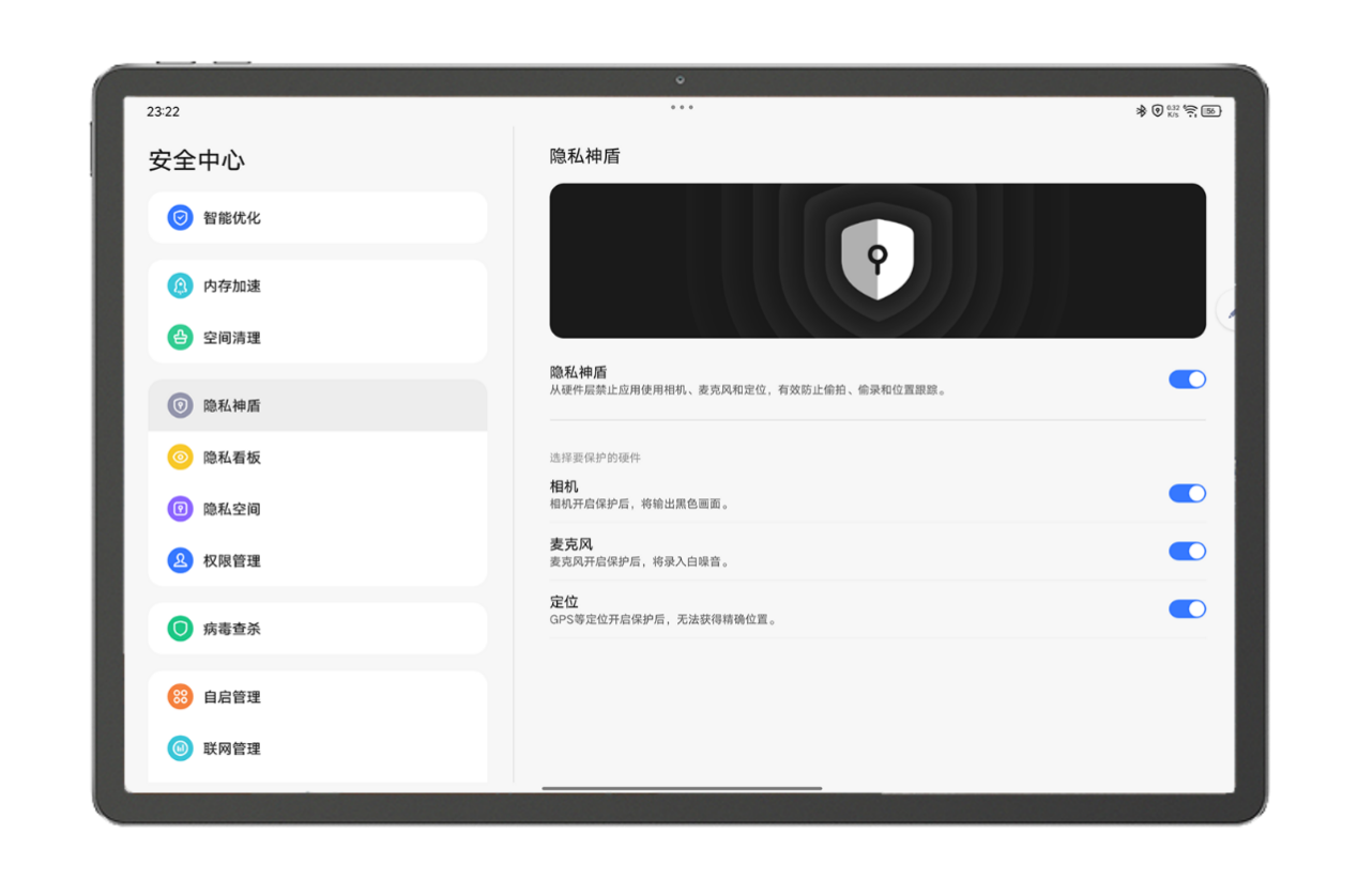 如果在使用平板时有特殊的安全需求,还可以开启隐私神盾,可以从硬件层禁止相机、麦克风、定位功能的使用,从根本上保证隐私安全。
