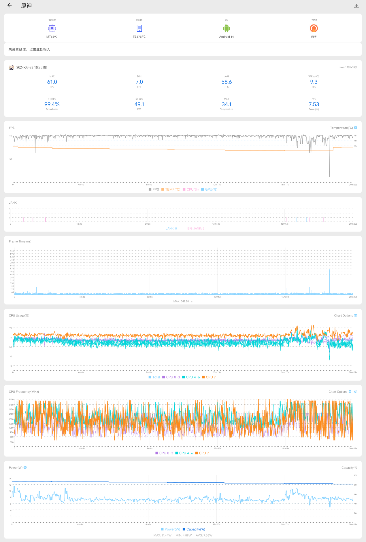 这块 12.7”的大屏上能获得和端游一样的优秀游玩体验。金铲铲之战虽然看似是普通的策略战棋类游戏,但当画质拉满时对性能的要求同样很高,从测试中可以看出整机峰值功耗已经超过了 10W 大关,同时金铲铲每局游戏时间相较于其他游戏更长,也更能考验机器的持续性能释放能力。联想平板小新 Pad Pro 在金铲铲中表现还是相当不错的,除了最后一段激烈团战略有掉帧外其余时间基本是 60 帧一条直线,最后的平均帧率也达到了 58.8 帧。美中不足的是频率最高的那颗大核调度似乎有些保守,如果能调用更加激进我相信全程跑满 60 帧完全不是问题。