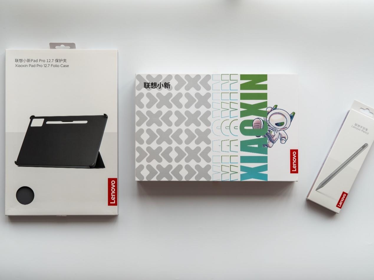 这次我收到的是联想小新 Pad Pro 12.7(二代)舒视版 + 保护壳 + 手写笔的组合套餐。包装盒整体的设计风格和自家的 PC 产品非常一致,作为主打年轻人的系列,平板本体的包装盒配合和设计语言也是非常年轻化。