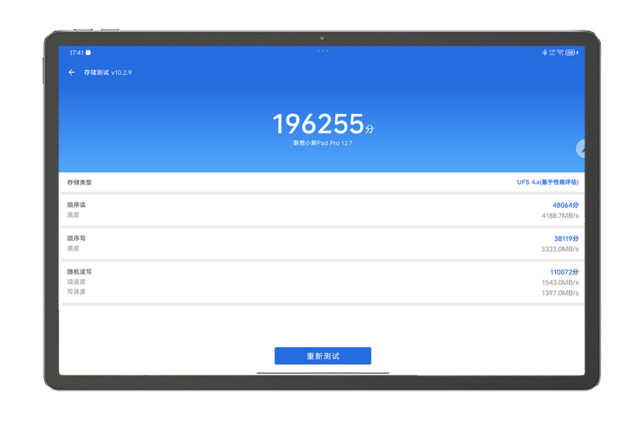 性能实测部分,即便是我这台 8GB+256GB 版本的低配内存版本也能在最新的安兔兔 V10 中取得 125W + 的成绩,闪存的读取速度也是轻松突破 4000MB/s 大关。得益于平板本身的热处理能力和天玑 8300 优秀的能耗表现,即便是 20 轮 3Dmark Wild Life 测试后联想平板小新 Pad Pro 依然能获得 90% 的优秀表现,循环分数几乎一条直线。