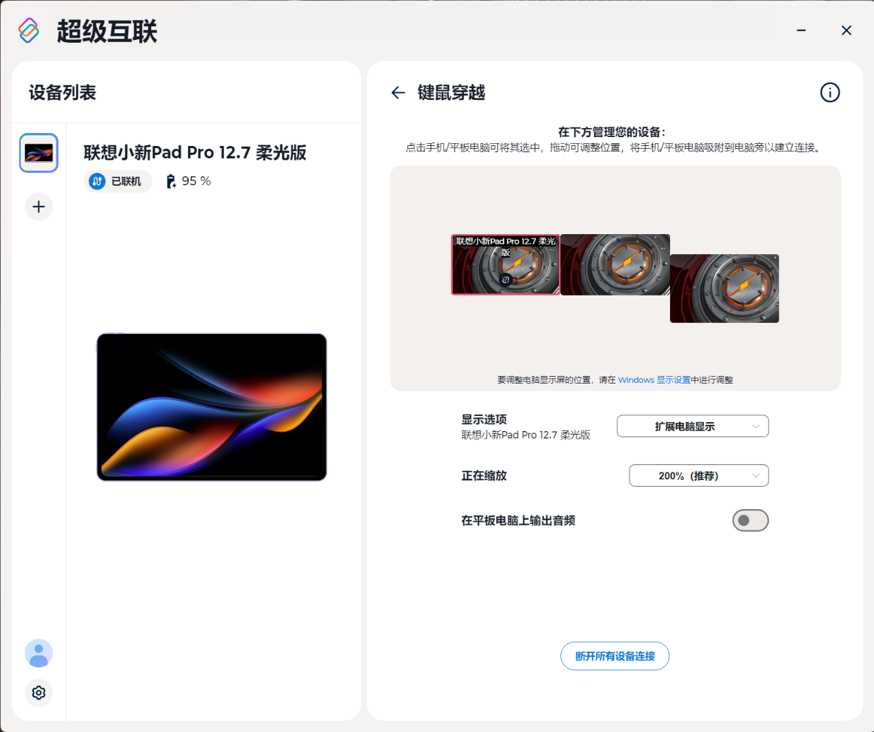 那既然键鼠都能在平板上直接使用了,屏幕自然也不能落下,超级互联甚至支持直接将小新 Pad Pro 作为 PC 的拓展屏和音频输出设备,12.7”的尺寸显示个 PC 网页或文档也是完全够用了,可以说是把这块大屏的利用率做到极致了。