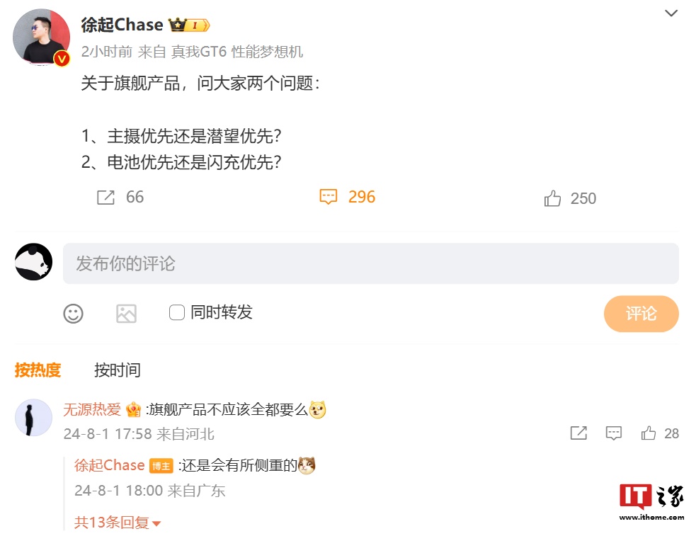 IT之家 8 月 1 日消息,realme 真我副总裁徐起今日在微博发起旗舰手机电池、相机配置的提问: