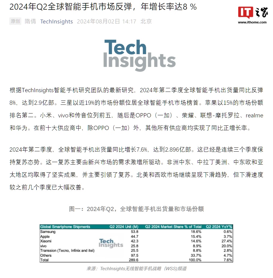 IT之家 8 月 2 日消息,市场调研机构 TechInsights 今天发布 2024 年第二季度全球智能手机出货报告,数据显示该季度全球智能手机出货量同比反弹 7.6%,达到 2.896 亿部。