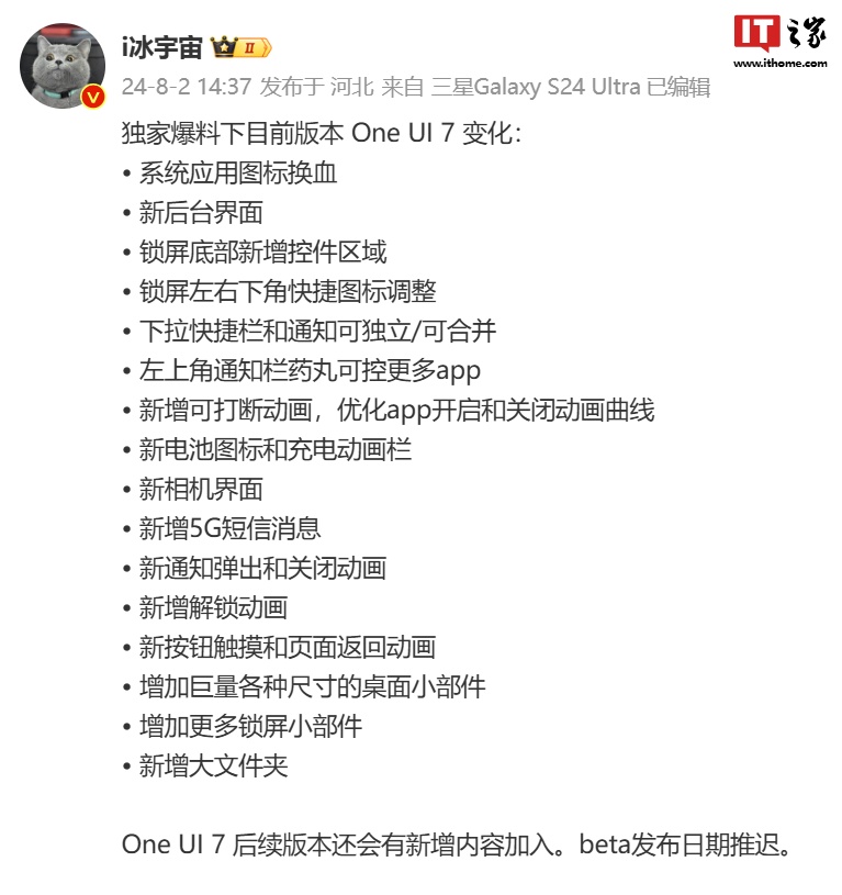 IT之家 8 月 2 日消息,博主 @i冰宇宙 今日爆料了三星 One UI 7 的多项变化: