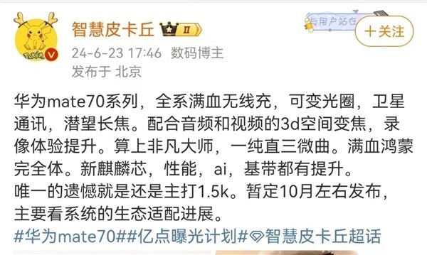 文章来源于互联网:凤凰网-华为Mate70系列爆料合集 预计10月发布