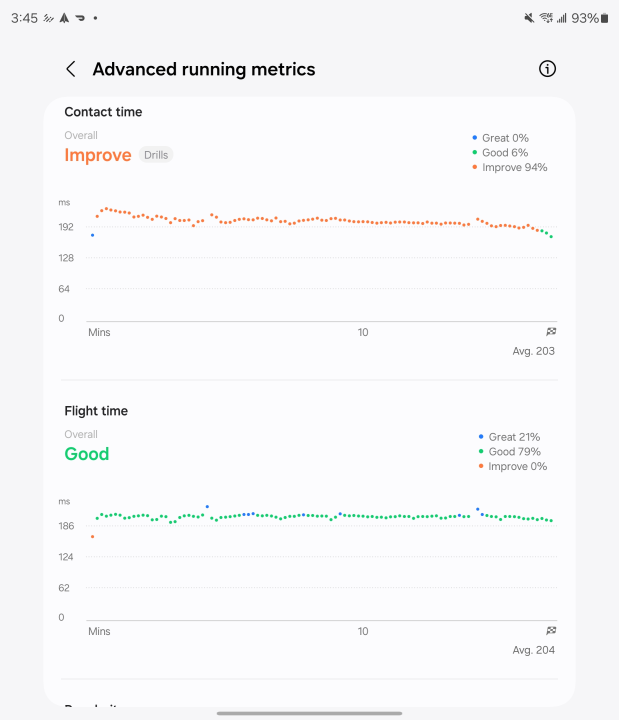另一个值得一提的点是数据展示方式。Samsung Health 和 Apple Fitness 应用都非常优秀,能够清晰有序地展示运动数据。然而,我认为三星在呈现一些“技术性”指标方面做得更好。跑步后,你可以点击“高级跑步指标”查看不对称性、接触时间、飞行时间、规律性、垂直振动和刚度的细分。这些指标会被评级为“优秀”、“良好”或“需改进”,对于需要改进的指标,你可以点击“训练”按钮查看一系列相关的锻炼计划。这一功能在 Galaxy Watch Ultra 中并不新鲜,但相较于 Apple Watch 只是展示数据图表而无任何解释,这种布局更为实用。