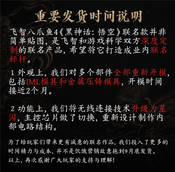 对于网友吐槽,飞智官方在《重要发货时间说明》中称,飞智八爪鱼4《黑神话:悟空》联名款并非简单贴图,而是和游戏科学双方深度定制,对多个部件重新开模,包括IML模具和金属压铸模具,开模时间近2个月。