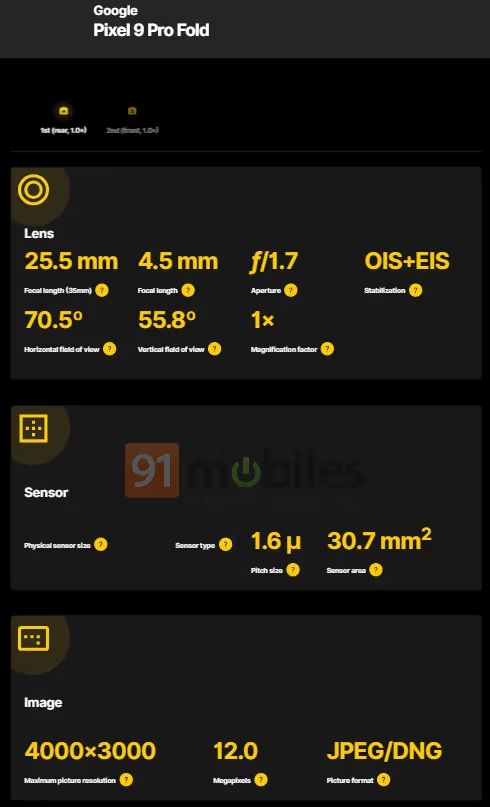 谷歌 Pixel 9 Pro Fold 手机背面配有 4800 万像素主摄,页面信息显示在 Pixel-binned 情况下为 1200 万像素。