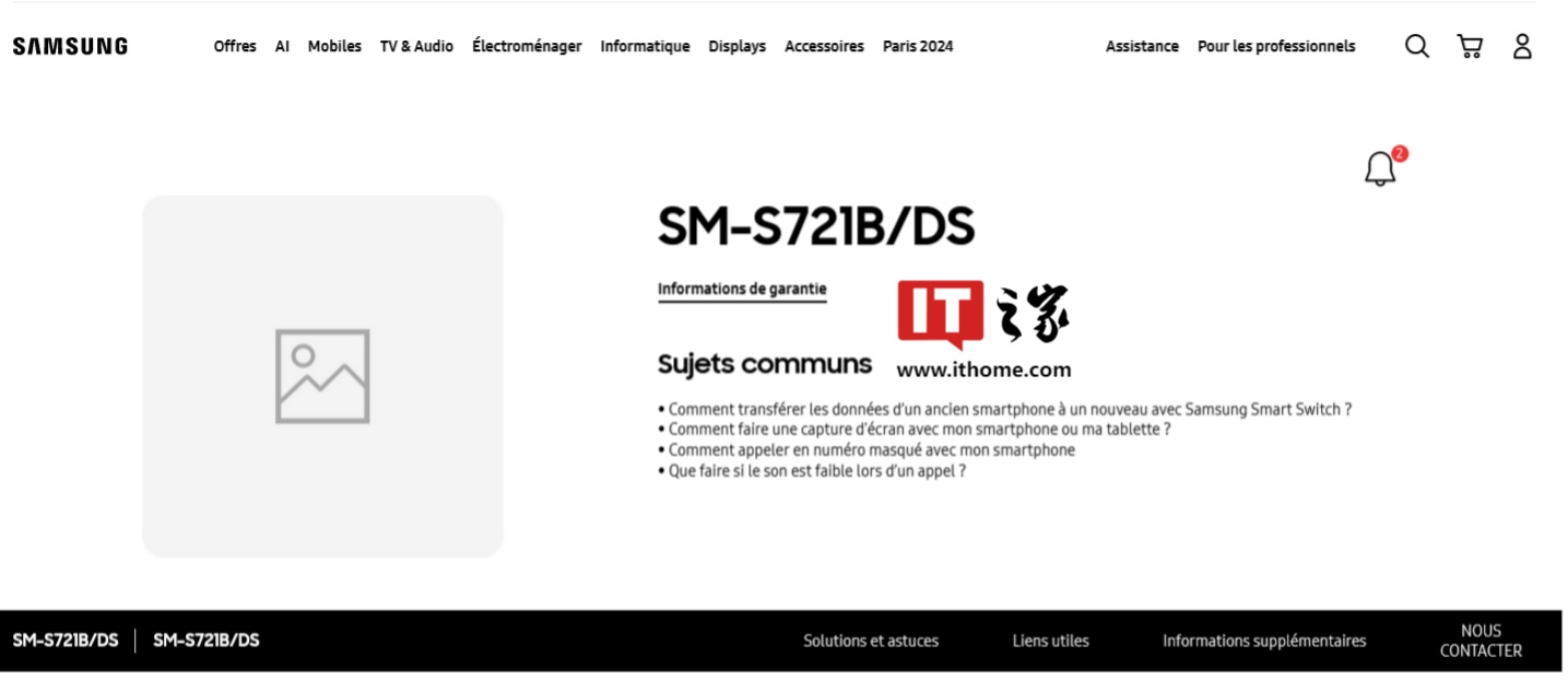 IT之家 8 月 6 日消息,科技媒体 SamMobile 昨日(8 月 5 日)发布博文,表示在三星法国官网上发现了“SM-S721B”的支持页面,而此前 IMEI 数据库信息确认该型号为国际版 Galaxy S24 FE 手机。