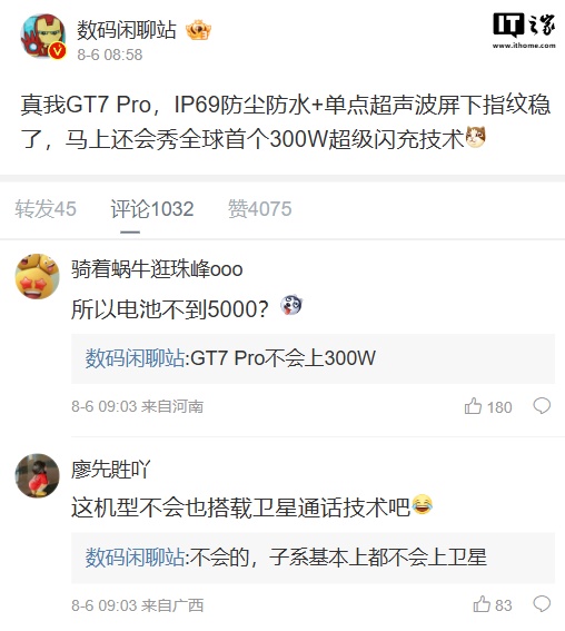该博主还称,真我 GT7 Pro 手机搭载 IP69 防尘防水 + 单点超声波屏下指纹,不过不会实装 300W 快充。